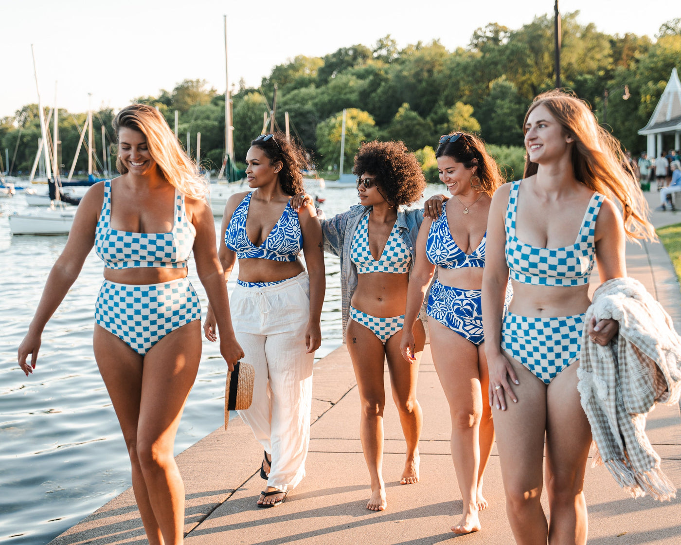 Five women in matching blue and white swimsuits sitting on a dock by a lake. Five women in matching blue and white swimsuits sitting on a dock by a lake.
